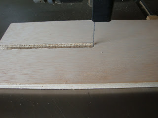 First off, I need to make a jig to get the perfect half round for the top and bottom. Cutting large circles is best performed on the band saw. Below you can see the miter gauge bar and a piece of 1/2 plywood I'm going to use for the base of the jig. I cut the dado so that the bar will fit snug, no play. Then I glue it to the base. The slot was cut using a hand saw.